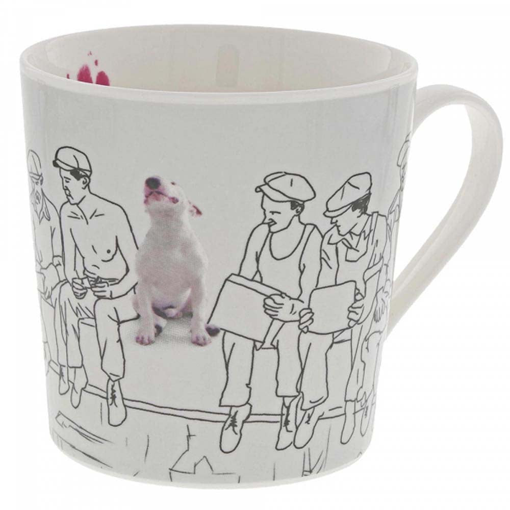 Jimmy the bull posing as a construction worker, can you spot him? Warm yourself up with a brew in our fantastic Jimmy mug, a gift fit for any dog lover. Jimmy's Story: When Rafael Mantesso's wife left him, she took everything except their beloved bull terrier, whom she'd named after her favourite shoe designer: Jimmy Choo. With only Jimmy for company, Rafael found inspiration in his best friend, blank walls and a magic marker. Each mug is presented in a branded gift box. Material; Ceramic. Dishwasher safe. Not a toy or children's product. Intended for adults only. Mug measures 9.5cm